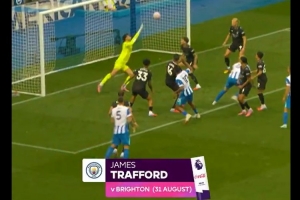 英超第3輪,曼城客戰布萊頓,此役第88分鐘,布萊頓右側角球機會,小禁區線范赫克的攻門被特拉福德擋出。