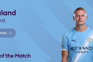 本場比賽哈蘭德打進2球,并有1次助攻,賽后他也當選英超官方球迷票選全場最佳球員。