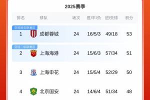 爭冠4隊(duì)積分情況:蓉城53分海港51分,申花50分國安48分!