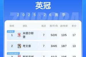 積分榜方面,米德爾斯堡5勝2平領跑,蘭帕德執教的考文垂3勝4平排在第二。萊斯特城第5,伊普斯維奇少賽1場排在第12。