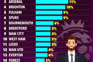 調查結果揭示了明顯的南北著裝差異,榜單前七名均被來自倫敦和南部的球隊包攬。曼城、利茲聯、布倫特福德和西漢姆聯以5%的數據并列第八。