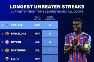 體育資訊10月1日訊 根據德轉統計,水晶宮是五大聯賽當前各項賽事不敗場次最多的球隊,他們自4月以來已經跨賽季18場不敗。