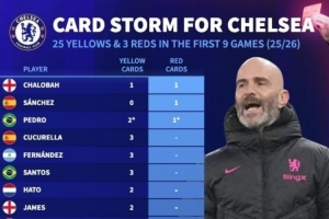 體育資訊10月1日訊 德國轉會市場統計,切爾西新賽季前9場比賽,領到25張黃牌和3張紅牌。