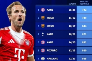 本賽季開局,凱恩僅用742分鐘時(shí)間就為拜仁造了20個(gè)進(jìn)球(進(jìn)球+助攻),比2011年的梅西快了7分鐘,刷新歷史。