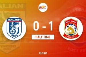 傷停補時4分鐘。上半場比賽結束,大連英博0-1青島西海岸。