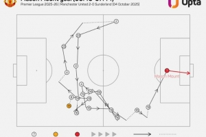 據統計,芒特進球前經過18次傳球,這是本賽季英超進球中最多,而曼聯上一次進球前有如此多傳球還在2023年9月(B費進球)。