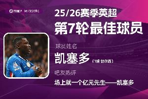 2025-2026賽季英超火熱進行中,體育資訊和咪咕體育聯(lián)合發(fā)起每輪英超最佳球員評選活動!第7輪評選結(jié)果出爐,切爾西后腰凱塞多攻防兼?zhèn)?,轟入世界波幫助切爾西2-1戰(zhàn)勝利物浦,獲得吧友5.6萬票的支持,當(dāng)選 【體育資訊X咪咕體育英超第7輪最佳球員】!