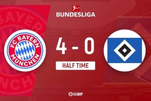 上半場比賽結束,拜仁慕尼黑4-0漢堡。