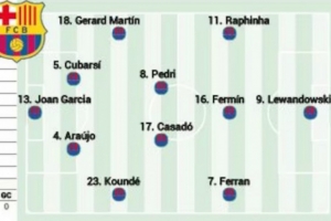 西班牙媒體《阿斯報》預測了巴薩此役的首發陣容,萊萬、費蘭-托雷斯、拉菲尼亞組成鋒線三叉戟,卡薩多則在中場首發。