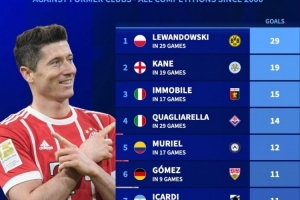 體育資訊9月14日訊 德國轉會市場統計了本世紀五大聯賽球員對陣老東家的進球數量,并列出榜單,萊萬對陣多特打進29球居首,凱恩對陣萊斯特城攻入19球次席。