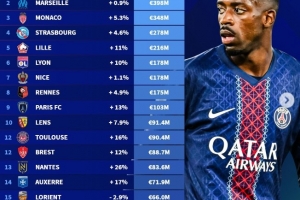 以下為法甲俱樂部身價(jià)排行情況: