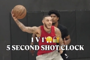 訓練師曬騎士后衛朗佐-鮑爾、開拓者后衛斯庫特-亨德森,以及另一位職業球員Milan Acquaah的單挑訓練視頻,進攻時間限時5秒。