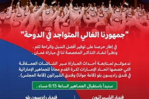 我們邀請您在阿聯酋足球協會為阿聯酋球迷免費提供的位于麗笙酒店(喬安娜廳)和喜來登酒店(馬吉利斯廳)的巨型屏幕上關注比賽動態。我們將于18:15(22:15)開始接待公眾?!?/p>