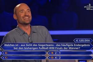 體育資訊10月11日訊 在德國版的《誰想成為百萬富翁》智力競賽節目中,一位參賽者沒能回答對世界杯決賽的比分,錯失12.5萬歐元(約103萬人民幣)獎金。