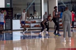 體育資訊10月15日訊 在今天的76人隊內訓練中,恩比德與隊友輪流進行一對一的單挑。
