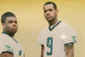 詹姆斯轉發了媒體rare_sports發布的他和高中隊友Sian Cotton身穿圣文森特圣瑪麗高中橄欖球隊球衣的合照。