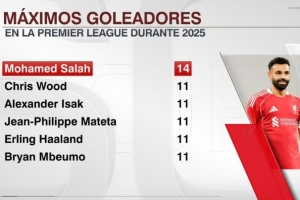 這是薩拉赫在2025年英超打進的第14球,領跑所有球員,并列次席的伍德、伊薩克、馬特塔、哈蘭德以及姆伯莫均是打進11球。