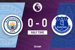 上半場傷停補時2分鐘,半場結束,曼城暫0-0埃弗頓。