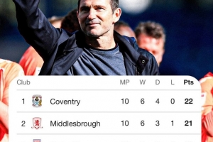 考文垂本賽季前10場英冠6勝4平保持不敗,在積分榜上以1分優勢領先米德爾斯堡位居榜首,球隊10場比賽打進29球(聯賽最多),只丟7球(已經連續5場零封)。