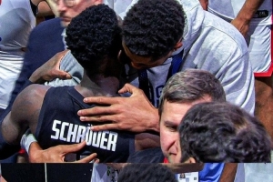 比賽賽后,同時入選最佳陣容的字母哥和施羅德擁抱致意。對此,施羅德表示:“揚尼斯做出了非常棒的舉動,他主動來找我,說我們各自代表德國和希臘為國征戰,而他這次也終于為希臘隊贏得了首枚大賽獎牌。我對他只有敬佩——他有四個可愛的孩子、賢惠的妻子,還有始終陪伴他的兄弟,一家人都在為籃球事業努力。更不用說他在NBA賽場上的表現,那完全是另一個級別的存在,絕對是世界頂尖球員之一。他主動過來和我交流,這種舉動充滿了體育精神,非常難得。他還說一直在看我們球隊的YouTube視頻,我覺得這種跨國家的球員互動,對希臘和德國的籃球交流也很有意義。”