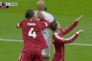 體育資訊10月19日訊 英超第8輪利物浦vs曼聯(lián),曼聯(lián)先進(jìn)一球,第1分鐘姆伯莫破門(mén)。進(jìn)球前的爭(zhēng)頂,范迪克爭(zhēng)頂中肘擊麥卡利斯特!