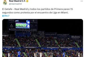 體育資訊10月20日訊 西甲第9輪,皇馬客戰赫塔費,兩隊球員開場暫停15秒以抗議西甲海外賽,皇馬也在社媒和官網發文。