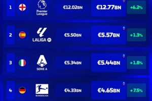 體育資訊10月20日訊 德轉此前更新了足壇球員身價,并盤點了五大聯賽球隊總身價榜,其中英超遙遙領先,以下為具體情況: