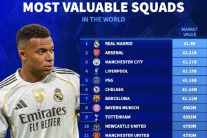 體育資訊10月20日訊 德轉統計了最新的俱樂部身價榜,其中,皇馬以14億歐高居榜首,阿森納、曼城分列二、三,共7支球隊突破10億歐。