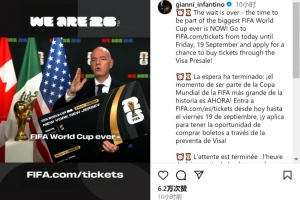 體育資訊9月11日訊 國際足聯主席因凡蒂諾更新社媒動態,宣布世界杯球票銷售即將開始。