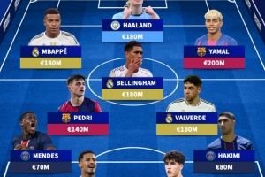 前鋒:姆巴佩(1.8億歐)、哈蘭德(1.8億歐)、亞馬爾(2億歐)