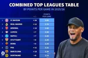 體育資訊10月28日訊 《轉(zhuǎn)會市場》更新了本賽季五大聯(lián)賽球隊的場均拿分情況,拜仁、皇馬、阿森納分列前三。