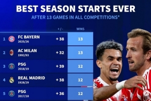 德轉列五大聯賽球隊賽季各項賽事前13場最佳開局: