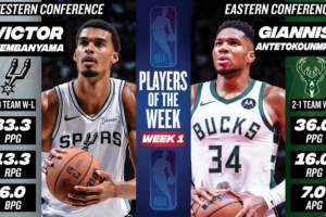 體育資訊10月28日訊 NBA官方宣布,字母哥和文班亞馬分別當選了東西部第一周的周最佳球員。