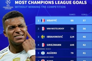 體育資訊9月17日訊 德國轉會市場統計了沒有贏得歐冠球員的歐冠進球數量,并列出榜單,姆巴佩57球居首。