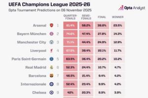 體育資訊11月06日訊 歐冠聯賽階段第4輪的比賽已經全部結束,OPTA超算更新了歐冠奪冠概率。