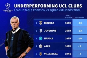 體育資訊11月6日訊 德國轉會市場根據球隊目前歐冠排名與陣容身價排名的差距,列出了本賽季歐冠表現不佳球隊榜,本菲卡、尤文最差。