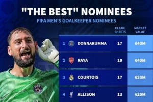 FIFA最佳門將候選身價排名:多納魯馬、拉亞4000萬歐居首