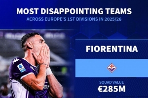 體育資訊11月7日訊 德國轉(zhuǎn)會市場根據(jù)球隊(duì)的身價和目前的排名,列出了本賽季歐洲頂級聯(lián)賽最令人失望球隊(duì),佛羅倫薩、紐卡、畢爾巴鄂競技在列。
