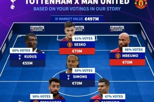 體育資訊11月8日訊 北京時間今天晚上20點30分,熱刺將在英超第11輪比賽中主場對陣曼聯。德國轉會市場根據關注者的投票列出熱刺+曼聯陣容,B費、舍什科、西蒙斯、范德芬在列。