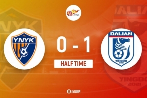 傷停補時3分鐘。上半場比賽結束,云南玉昆0-1大連英博。