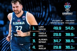 體育資訊9月21日訊 歐錦賽官方發布了本次賽事得分+助攻得分占全隊總分比重的前十,具體如下: