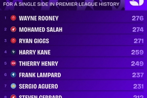 體育資訊9月21日訊 Squawka統計了球員在單一球隊參與英超進球的數量,并列出榜單,薩拉赫參與274球排名第二位,距離首位魯尼僅差2球。