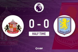 傷停補時3分鐘。上半場比賽結束,桑德蘭0-0阿斯頓維拉。
