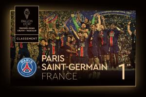 體育資訊9月23日訊 金球獎頒獎典禮,巴黎圣日耳曼當選最佳男足俱樂部。