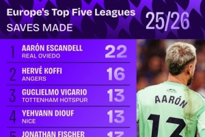 本賽季五大聯(lián)賽撲救次數(shù)排名: