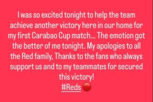 賽后,埃基蒂克在社媒向利物浦球迷道歉:“今晚能首次參加聯賽杯主場賽事并幫助球隊再奪勝利,我無比激動……但今夜情緒確實有些失控。在此向所有紅軍大家庭致歉,也感謝一直支持我們的球迷,以及攜手贏下比賽的隊友們!”
