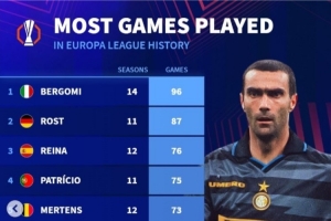 體育資訊9月25日訊 德轉統計了歐聯(含前身歐洲聯盟杯)球員出場數據,貝爾戈米96場成為出場王,雷納、曾加位居前十。
