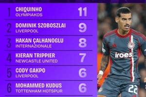 本賽季歐冠精準(zhǔn)傳中榜:奇奎尼奧11次第一,索博斯洛伊9次第二